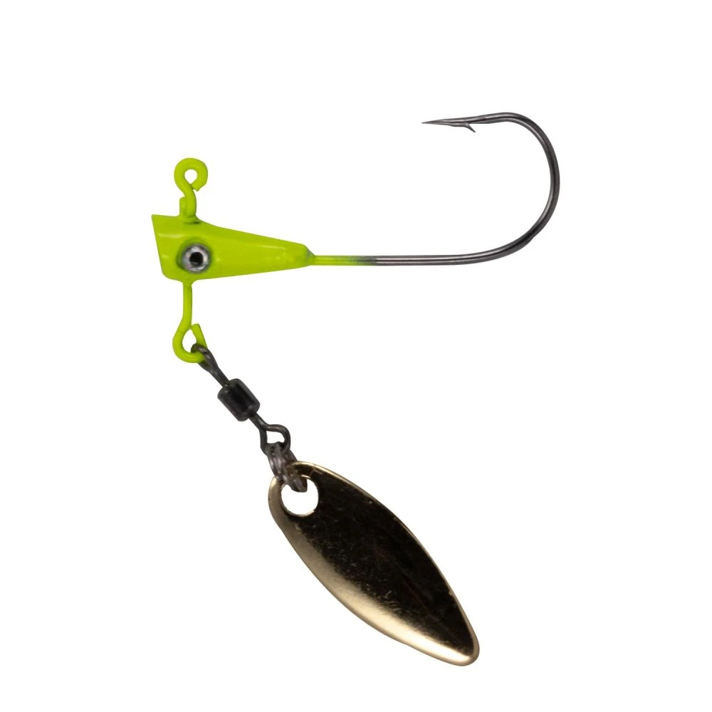 The Fin Spin blade will spin on the retrieve or the fall. It unique Shad dart shape creates a unique look and action. Just add a Crappie Magnet body or any solid jig body to add realistic action. The Double Cross barbs will hold onto any jig body longer than any other jig spinner combo. You can cast or troll the Fin Spin.