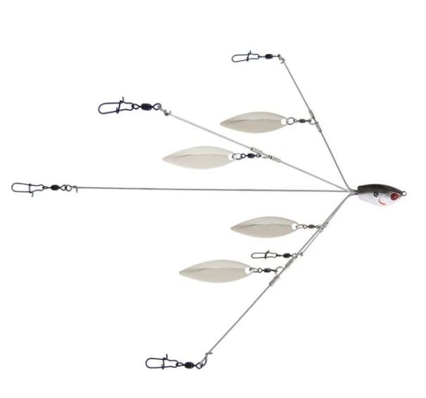 The Yumbrella Flash Mob Jr. is a compact, flashy, finesse-style umbrella rig equipped with four spinnerbait blades to help it further simulate a small school of baitfish. The little brother of the Yumbrella Flash Mob, it has all same the same great features – just with a smaller profile. Equipped with five super-strong, heat-treated stainless steel wires to ensure strength and flexibility, the Flash Mob Jr. also features high quality super strong snaps and swivels to ensure flawless performance when hooking multiple fish at the same time.